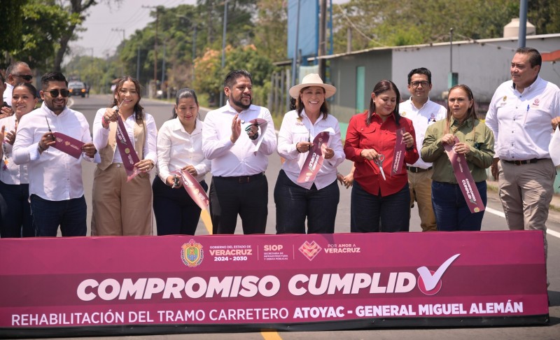 Atoyac, Ver., sábado 25 de abril de 2026.– La gobernadora Rocío Nahle García encabezó la entrega de la rehabilitación del tramo carretero Atoyac – General Miguel Alemán – entronque 150D Córdoba, obra que cumple un compromiso con la población y consolida la presencia de la Cuarta Transformación en la región centro del estado.