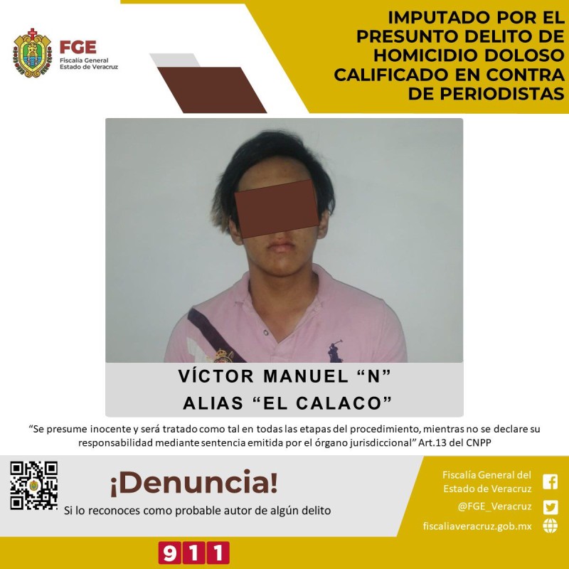 XALAPA, Ver., 7 junio 2022.- La Fiscalía General del Estado informa que a través de la Fiscalía Regional Coatzacoalcos, realizó imputación en contra de Víctor Manuel “N”, alias “El Calaco”, por el presunto delito de homicidio doloso calificado cometido en agravio de la directora del portal El Veraz, Yessenia Mollinedo Falconi y la reportera Sheila Johana García Olivera, hechos suscitados el pasado 9 de mayo del presente año en el municipio de Cosoleacaque.