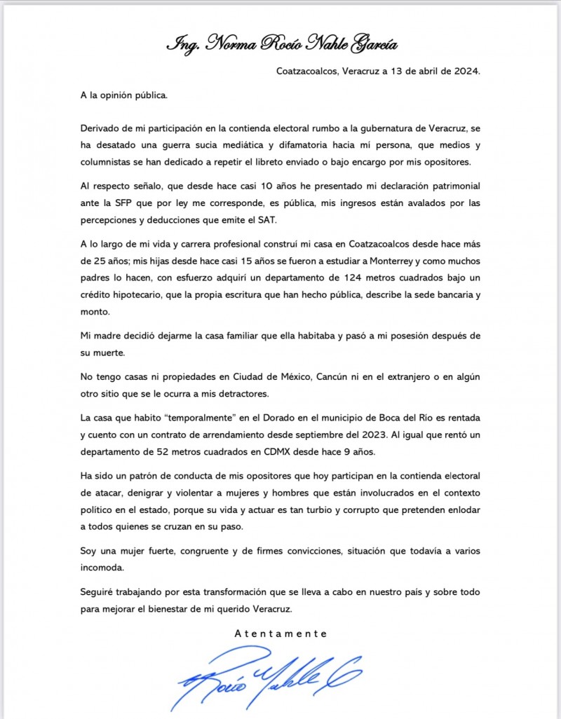 ROCÍO NAHLE PUBLICÓ CARTA ABIERTA A LA OPINIÓN PÚBLICA