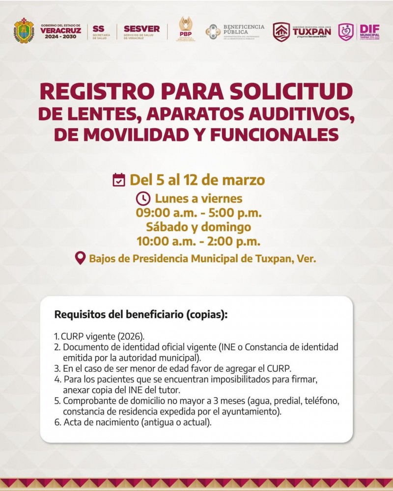 Tuxpan, Ver. | Redacción.- Bajo el lema “¡En Veracruz se trabaja y se atiende a nuestra gente!”, el gobierno municipal de Tuxpan, encabezado por Daniel Cortina Martínez, puso en marcha el registro para la entrega gratuita de aparatos funcionales y auxiliares de movilidad dirigidos a personas que más lo necesiten en el municipio. La convocatoria difundida por el ayuntamiento y por el propio alcalde establece que el módulo permanecerá instalado del 5 al 12 de marzo en los bajos de la Presidencia Municipal.