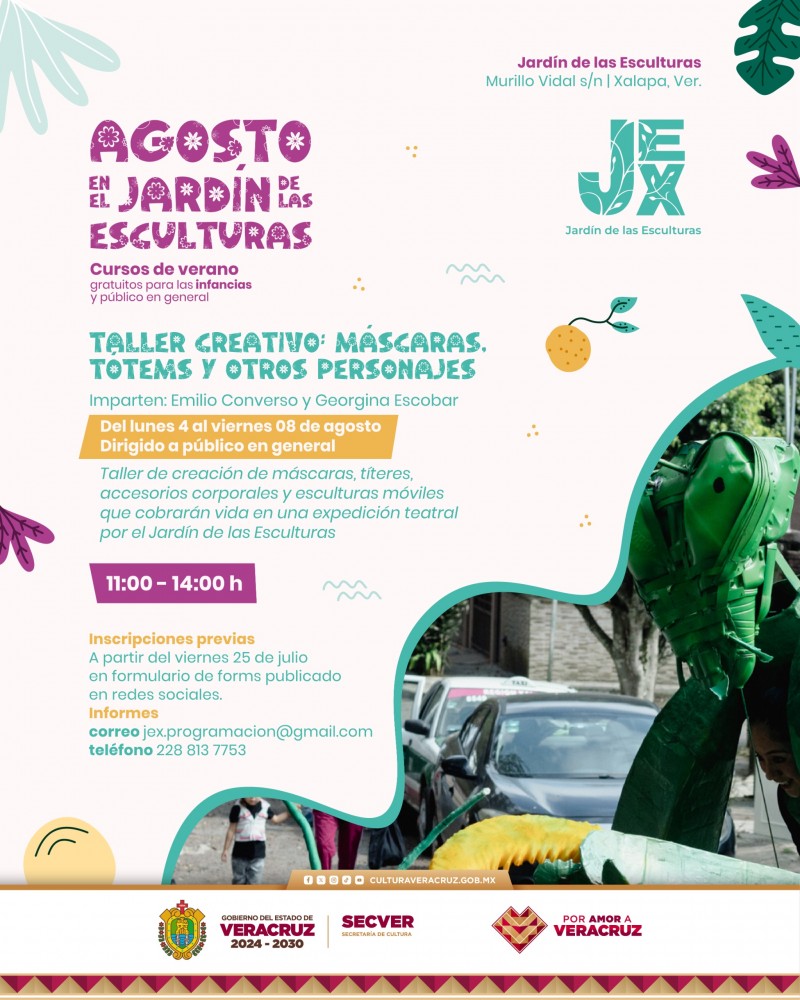Xalapa, Ver., martes 05 de agosto de 2025.- Como parte del programa Un Verano para ti, el Jardín de las Esculturas de Xalapa (JEX), impartirá los talleres gratuitos: Máscaras, tótems y otros personajes y Arteterapia desde la pintura hasta la reactividad para infancias, dos propuestas que explorarán las posibilidades del arte tridimensional a través del impulso creativo desde temprana edad.
