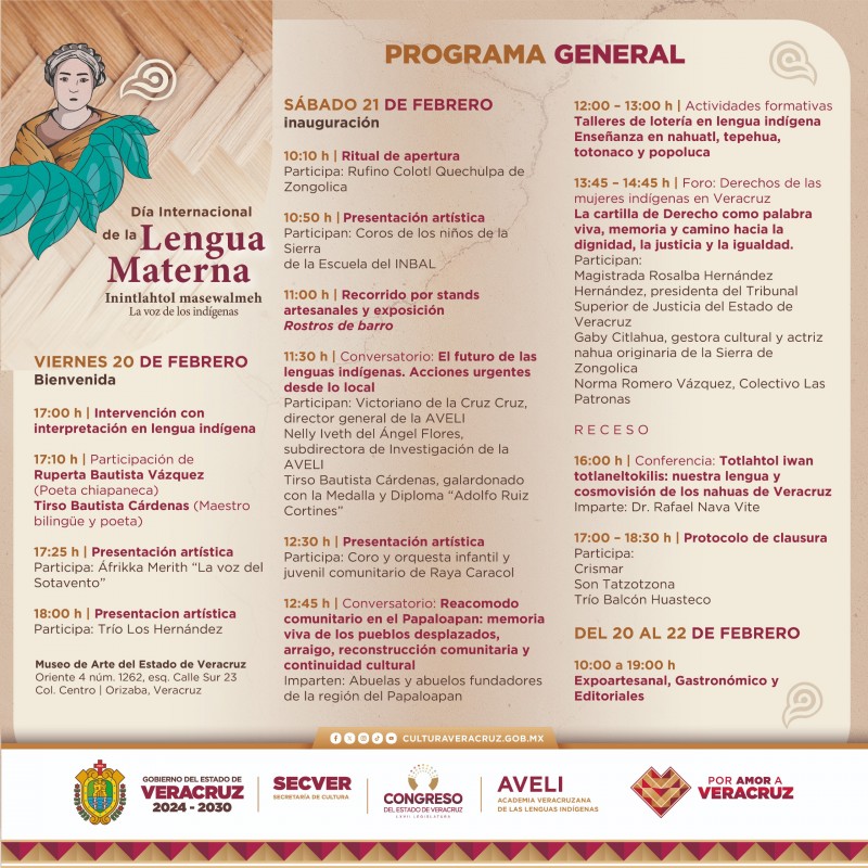 Xalapa, Ver., miércoles 18 de febrero de 2026.- La Secretaría de Cultura de Veracruz (SECVER), en colaboración con el Congreso del Estado y la Academia Veracruzana de las Lenguas Indígenas (AVELI), invita a la jornada conmemorativa del Día Internacional de la Lengua Materna Inintlahtol masewalmeh: La voz de los indígenas, que se realizará del viernes 20 al domingo 22 de febrero en el Museo de Arte del Estado de Veracruz (MAEV), ubicado en Orizaba. Todas las actividades serán gratuitas.
