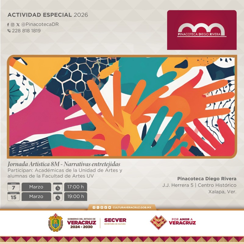 Xalapa, Ver., jueves 05 de marzo de 2026.- La Secretaría de Cultura de Veracruz (SECVER) en colaboración con la Unidad de Artes de la Universidad Veracruzana (UV), invita al público a la Jornada Artística 8M: Narrativas entretejidas, que se llevarán a cabo el sábado 07 y domingo 15 de marzo, a las 17:00 horas y 19:00, respectivamente, en el marco de la conmemoración del Día Internacional de la Mujer. La entrada es libre.