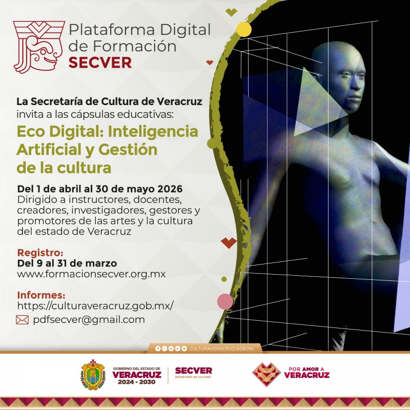 Xalapa, Ver., miércoles 11 de marzo de 2026.- La Secretaría de Cultura de Veracruz (SECVER) invita al público a participar en la serie de cápsulas educativas Eco Digital: Inteligencia Artificial y Gestión de la Cultura 2026, que se transmitirá del 07 de abril al 30 de mayo a través de la Plataforma Digital de Formación SECVER, disponible en el portal https://www.formacionsecver.org.mx/.