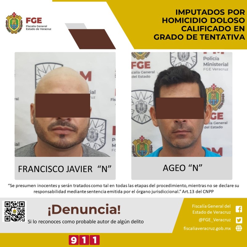 XALAPA, Ver; 21 de abril 2022.- La Fiscalía Regional de la zona Centro-Xalapa obtuvo de un Juez imputación en contra de Ageo “N” y Francisco Javier “N” por el presunto delito de homicidio doloso calificado en grado de tentativa.