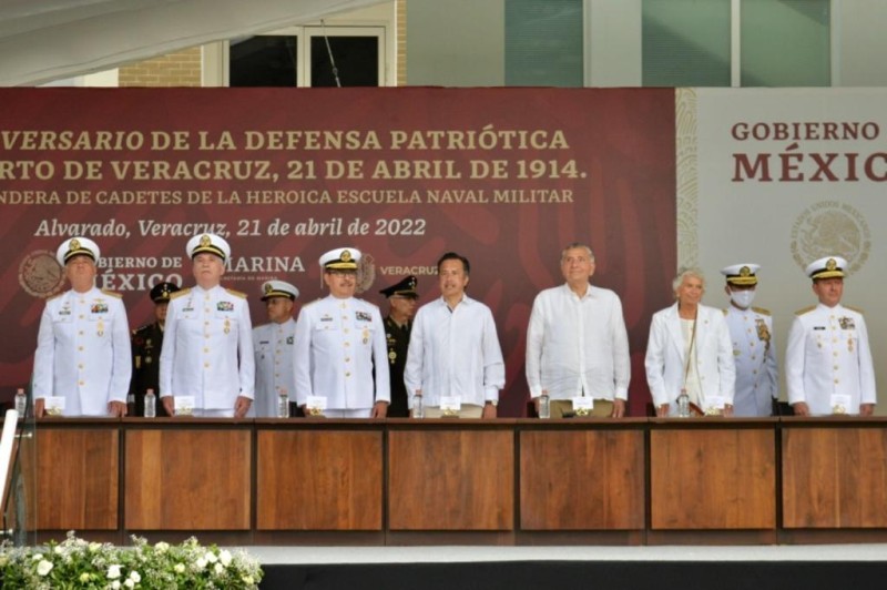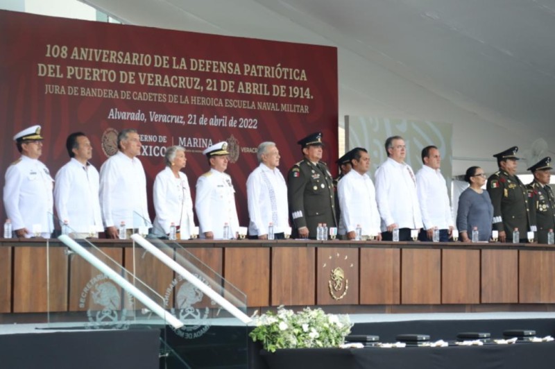 *Alvarado, Ver., 21 de abril de 2022.-* En el marco del 108 aniversario de la defensa patriótica del puerto de Veracruz, el presidente Andrés Manuel López Obrador, junto con el gobernador Cuitláhuac García Jiménez, encabezó la Jura de Bandera de cadetes de primer año en la Heroica Escuela Naval Militar generación 2021-2026.