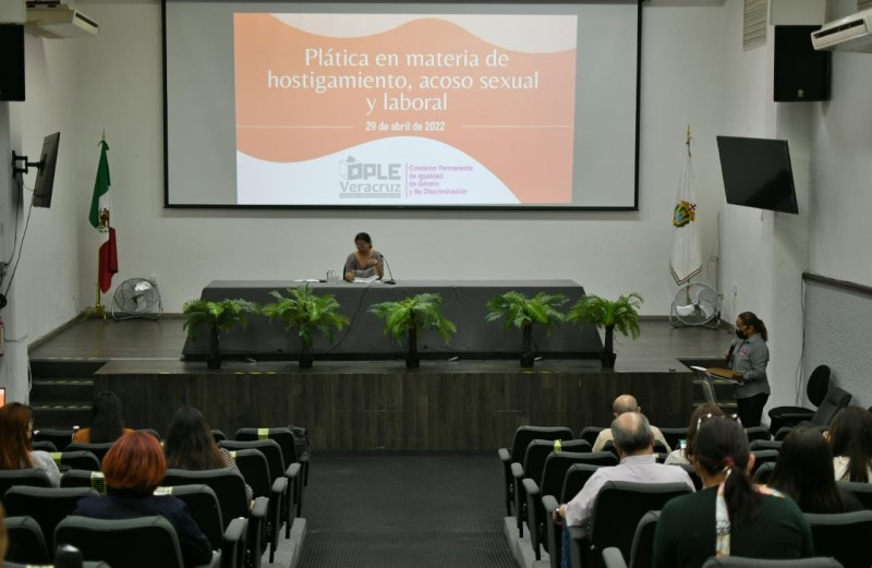 Xalapa, Ver., a 29 de abril de 2022. El Organismo Público Local Electoral del Estado de Veracruz (OPLE), a través de la Comisión Permanente de Igualdad de Género y No Discriminación, en coordinación con la Comisión Estatal de Derechos Humanos (CEDH), impartieron la plática en materia de hostigamiento, acoso sexual y laboral en el Auditorio “Leonardo Pasquel”, a cargo de la Mtra. Yeralding Sánchez Morales, titular de la Unidad para la Igualdad de Género de la CEDH.