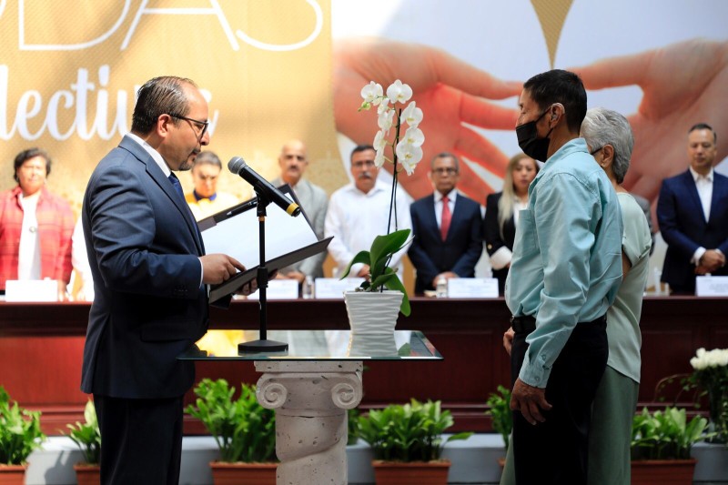 Durante la ceremonia se realizó el matrimonio civil de Tomás Torres Hernández y Clara Aburto Sangabriel, pareja con más de 50 años de vivir en unión libre y 3 hijos, quienes representaron a las más de 300 parejas que aprovecharon los beneficios de este programa.