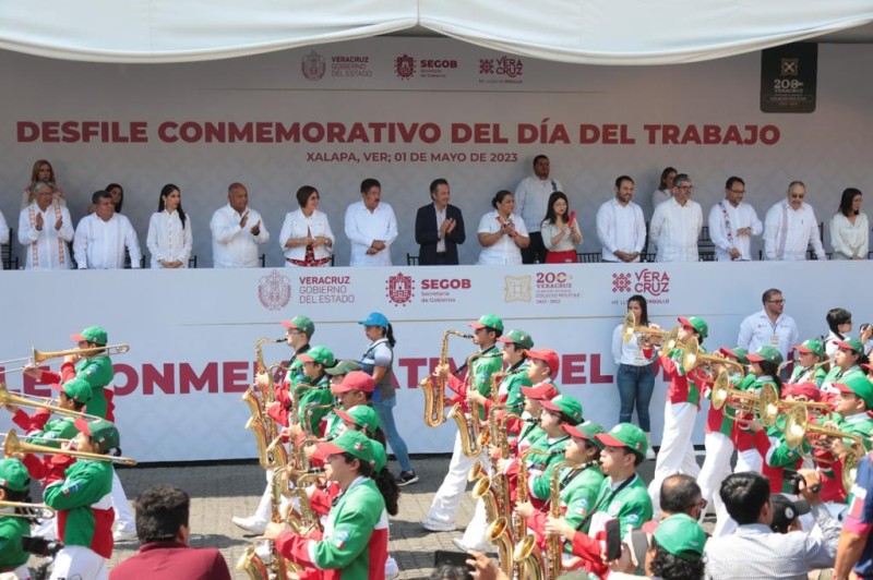 Xalapa, Ver., 01 de mayo de 2023.-* En el marco del Día Internacional del Trabajo, el gobernador Cuitláhuac García Jiménez y la secretaría del Trabajo, Previsión Social y Productividad, Dorheny Cayetano García presidieron el desfile conmemorativo en el que participaron 81 mil 800 personas, distribuidos en 12 contingentes de diferentes sindicatos, federaciones y centrales obreras.