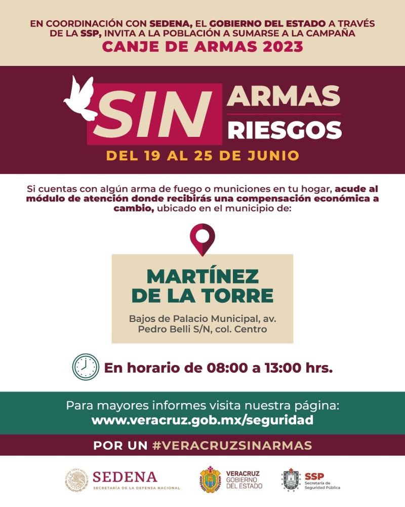 Xalapa, Ver., 19 de junio de 2023.- Por cuarto año consecutivo, la Secretaría de Seguridad Pública, en coordinación con la Secretaría de la Defensa Nacional, dio inicio a la campaña de canje Sin Armas, Sin Riesgos en Martínez de la Torre, la cual continuará hasta el 25 de junio.