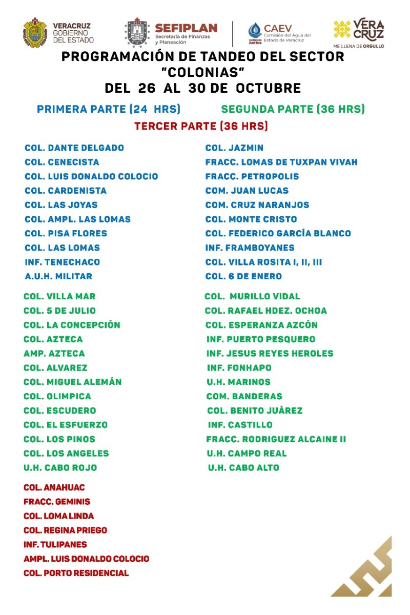 Programa de tandeo de CAEV correspondiente del 26 al 30 de octubre, para el circuito colonias de Tuxpan Veracruz