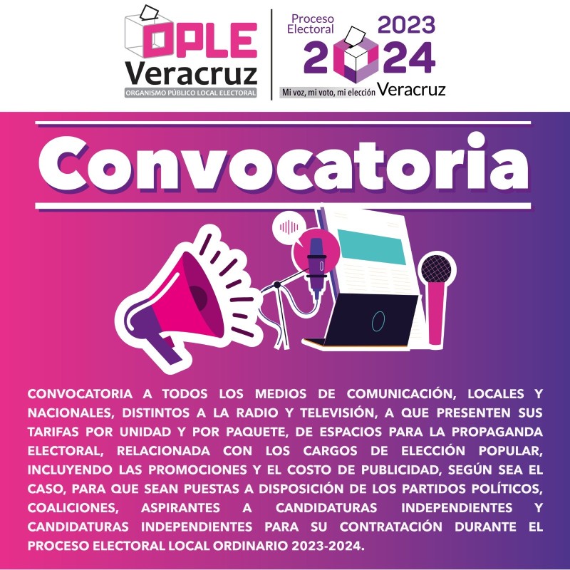Xalapa, Veracruz, 27 de noviembre de 2023. El Organismo Público Local Electoral del Estado de Veracruz (OPLE Veracruz) invita a medios de comunicación locales y nacionales -distintos a la radio y televisión- con cobertura en la Entidad a inscribirse en el catálogo de tarifas para que los Partidos Políticos puedan contratar sólo con estas empresas el servicio de propaganda electoral durante los periodos de precampaña, intercampaña y campaña.