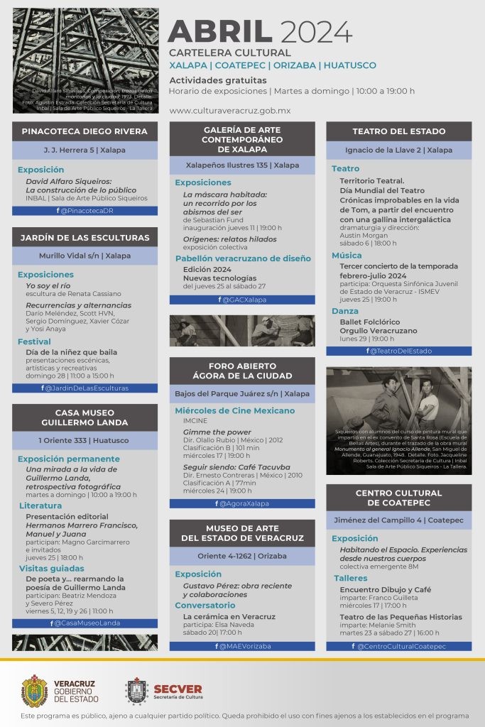 La Secretaría de Cultura de Veracruz presenta una oferta cultural muy interesante y diversa durante el mes de abril; invitamos a acercarse a conocer y disfrutar de exposiciones, conversatorios, talleres, música, teatro, literatura, cine y actividades de fomento a la lectura para todos los públicos en nuestra red de recintos culturales de Xalapa, Veracruz, Boca del Río, Coatepec, Orizaba, Huatusco, Tlacotalpan y Papantla.