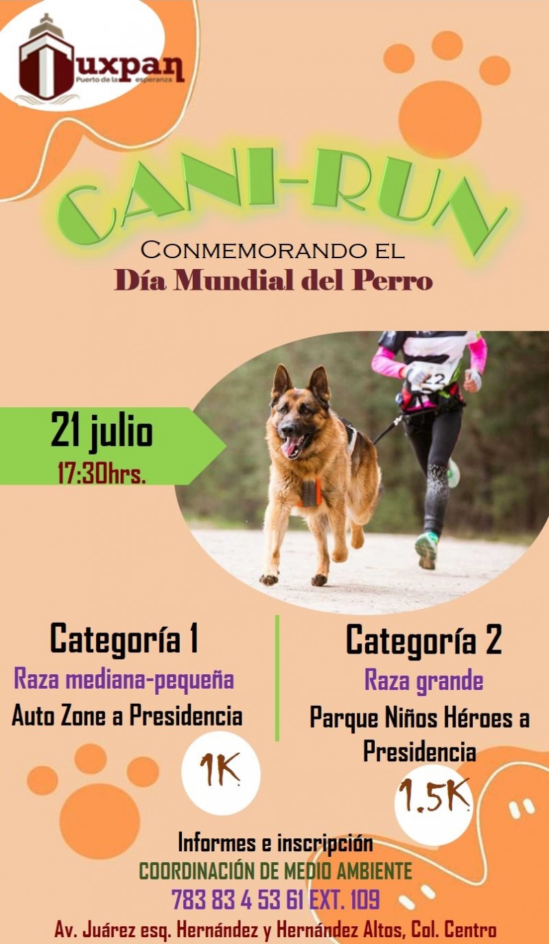 Tuxpan, Ver., 16 julio 2024.- El gobierno de Tuxpan, a través de la Coordinación de Medio Ambiente, te invitan a la carrera CANI-RUN que se realizará el próximo domingo 21 de julio a las 5:30 de la tarde, en el marco de la conmemoración por el Día Mundial del Perro.