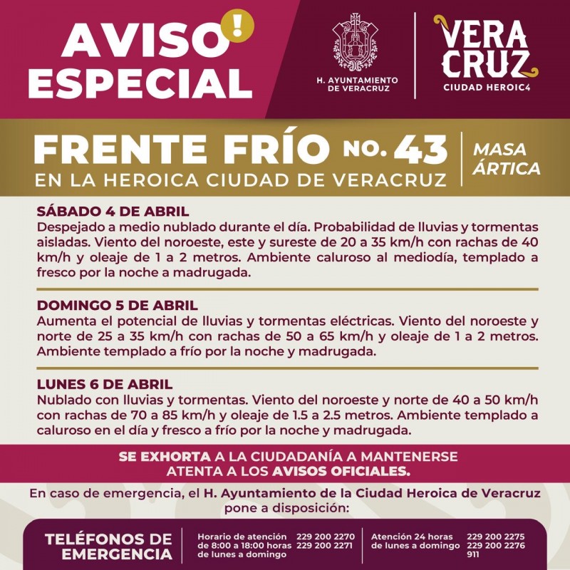 04 de abril de 2026| Veracruz, Ver.- La dirección de Protección Civil Municipal de Veracruz informa a la población que a partir de este domingo 5 de abril, el Frente Frío 43 ingresará a la ciudad con viento intenso, lluvias y aumento del oleaje, por lo que se exhorta a tomar precauciones para evitar riesgos en su integridad física y la de sus familias.