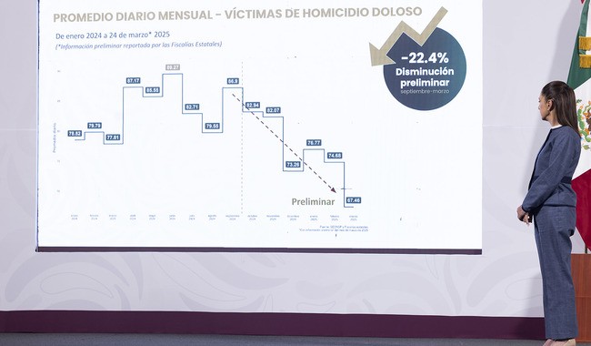 De septiembre 2024 a marzo 2025 se registró una disminución del 22.4 por ciento en el promedio diario mensual de víct...